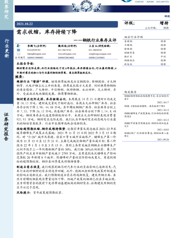 【国泰君安证券】【20211022】20211022-国泰君安-钢铁行业库存点评:需求收缩,库存持续下降-3页