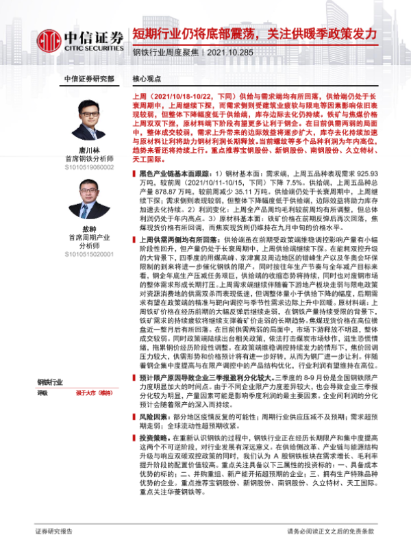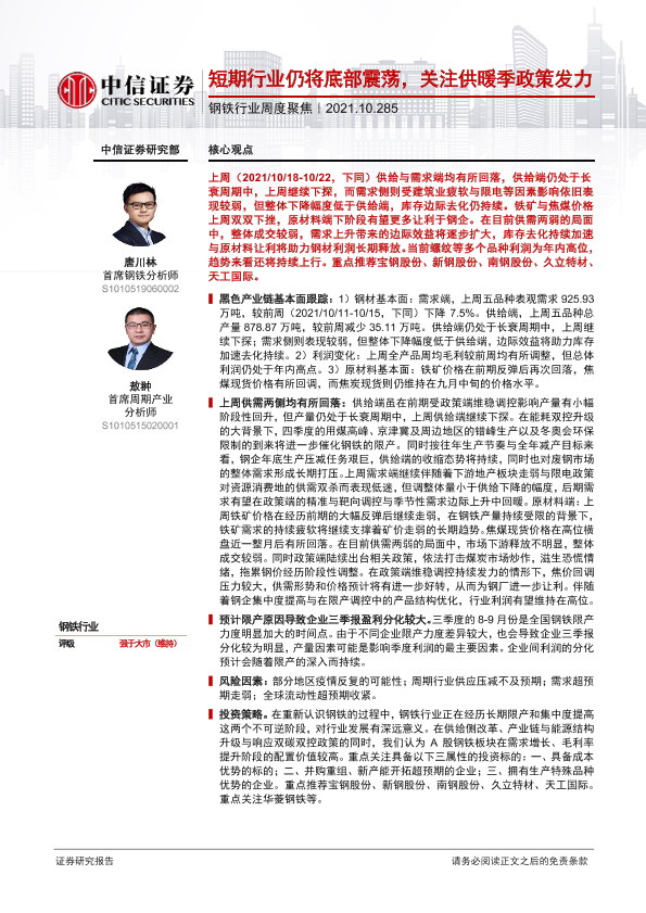 【中信证券】【20211028】20211028-中信证券-钢铁行业周度聚焦:短期行业仍将底部震荡,关注供暖季政策发力-12页