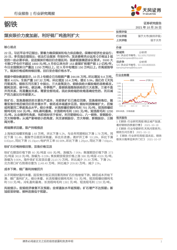 【天风证券】【20211026】20211026-天风证券-钢铁行业研究周报:煤炭限价力度加剧,利好钢厂吨盈利扩大-13页