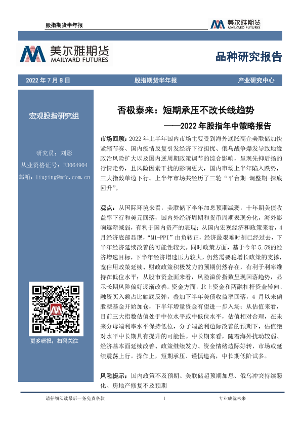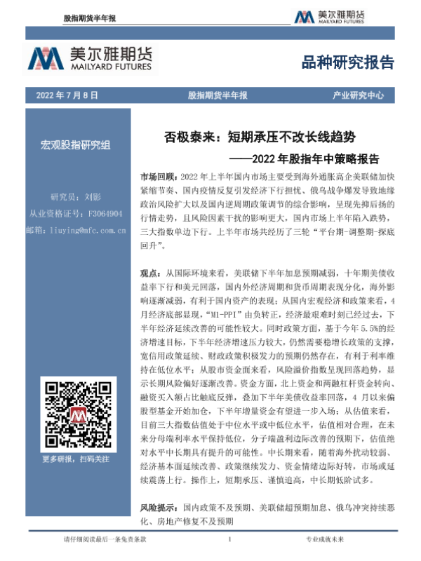 【美尔雅期货】【20220708】2022年股指年中策略报告:否极泰来,短期承压不改长线趋势-22页