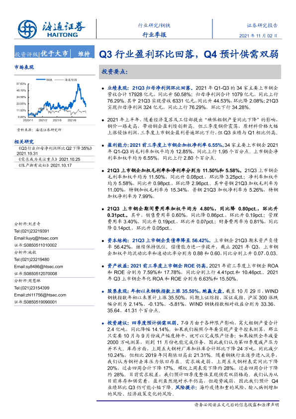 【海通证券】【20211102】20211102-海通证券-钢铁行业季报:Q3行业盈利环比回落,Q4预计供需双弱-13页