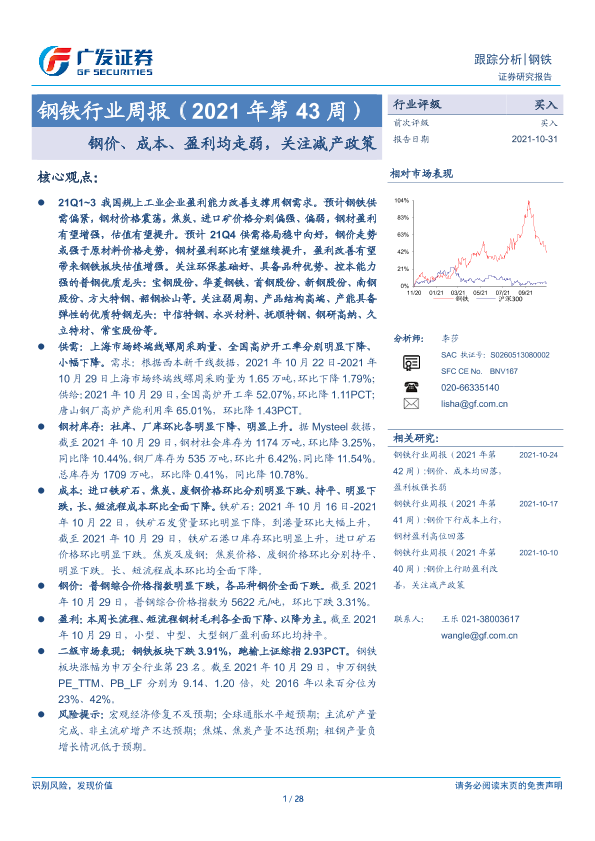 【广发证券】【20211031】20211031-广发证券-钢铁行业周报(2021年第43周):钢价、成本、盈利均走弱,关注减产政策-28页