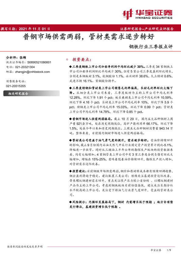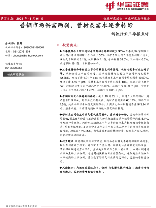 【华宝证券】【20211101】20211101-华宝证券-钢铁行业三季报点评:普钢市场供需两弱,管材类需求逐步转好-9页