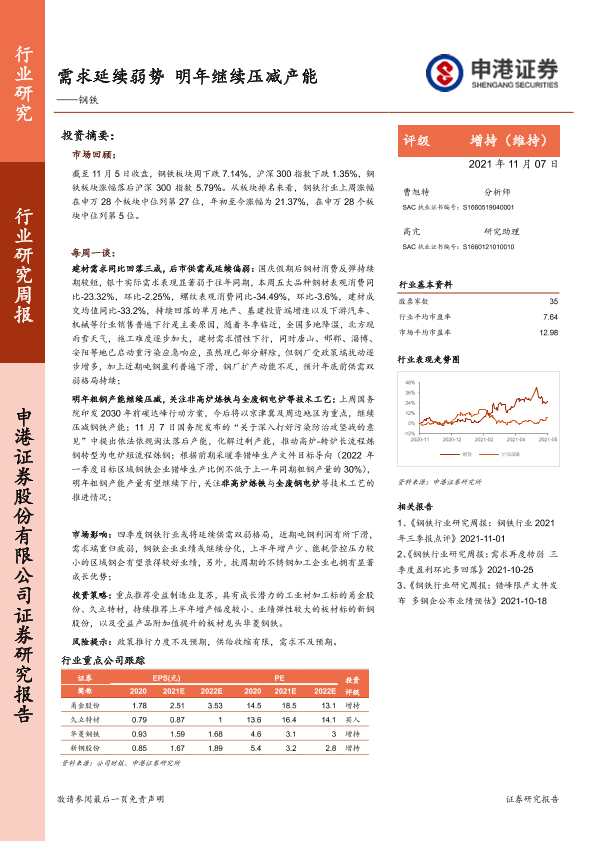 【申港证券】【20211107】20211107-申港证券-钢铁行业研究周报:需求延续弱势 明年继续压减产能-5页
