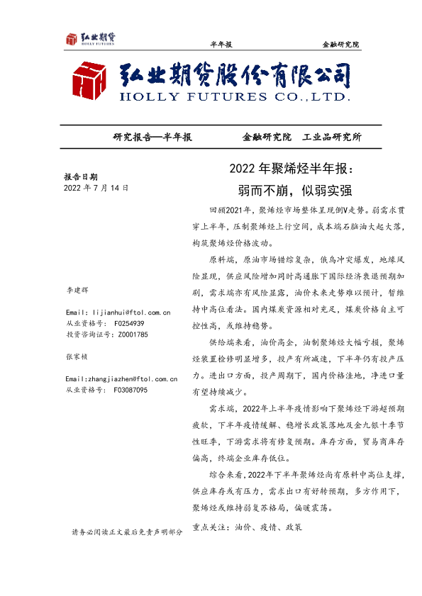 【弘业期货】【20220714】2022年聚烯烃半年报:弱而不崩,似弱实强-26页