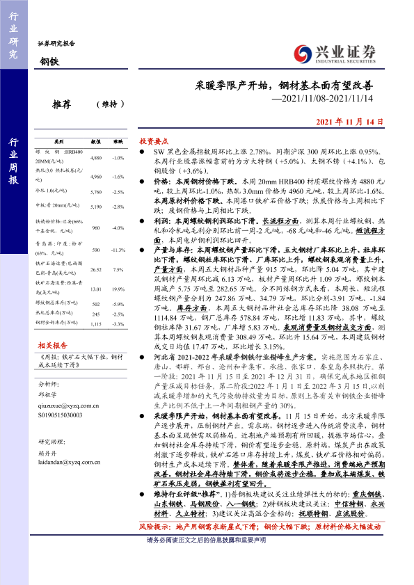 【兴业证券】【20211114】20211114-兴业证券-钢铁行业周报:采暖季限产开始,钢材基本面有望改善-17页