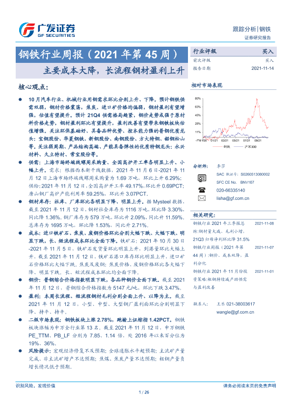 【广发证券】【20211114】钢铁行业周报(2021年第45周):主要成本大降,长流程钢材盈利上升-26页