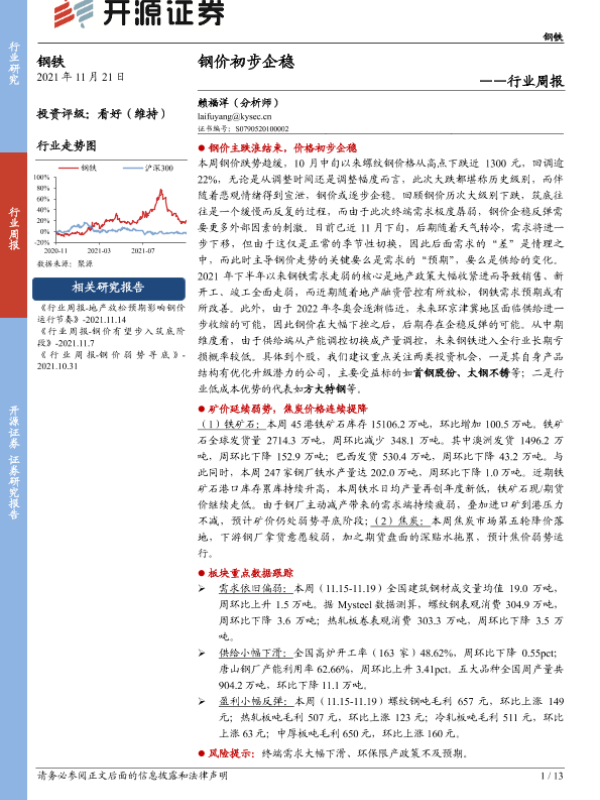 【开源证券】【20211121】20211121-开源证券-钢铁行业周报:钢价初步企稳-13页
