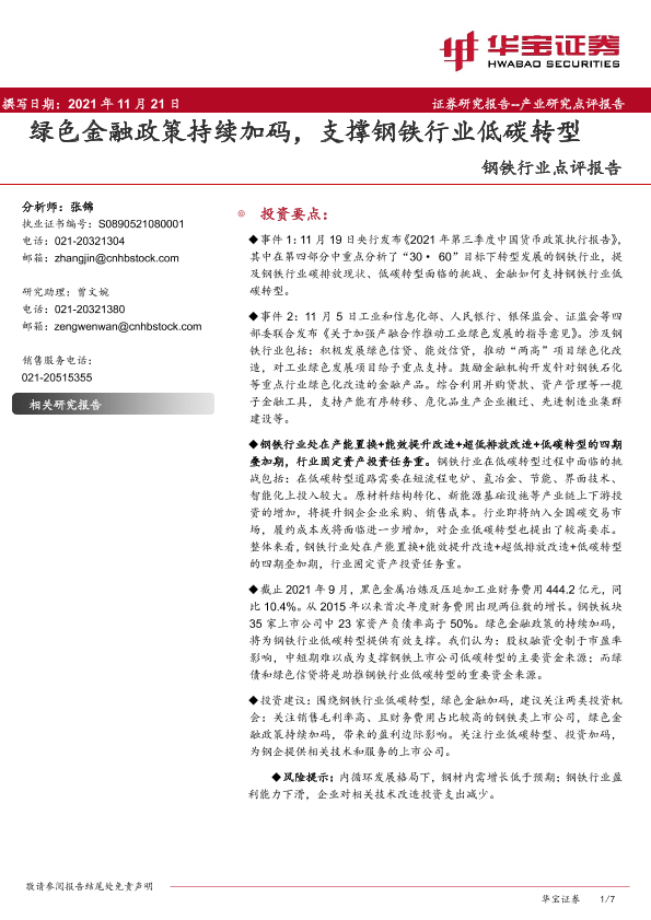 【华宝证券】【20211121】20211121-华宝证券-钢铁行业点评报告:绿色金融政策持续加码,支撑钢铁行业低碳转型-7页