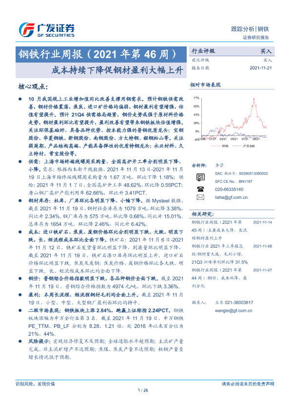 【广发证券】【20211121】20211121-广发证券-钢铁行业周报(2021年第46周):成本持续下降促钢材盈利大幅上升-26页