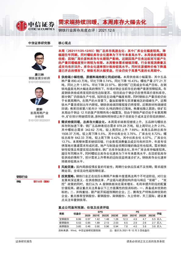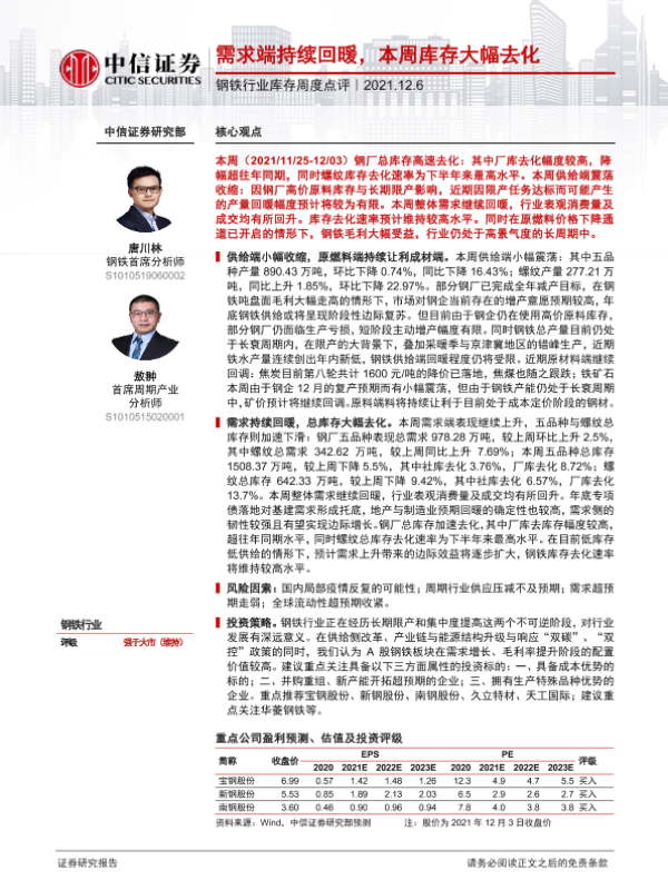 【中信证券】【20211206】20211206-中信证券-钢铁行业库存周度点评:需求端持续回暖,本周库存大幅去化-5页