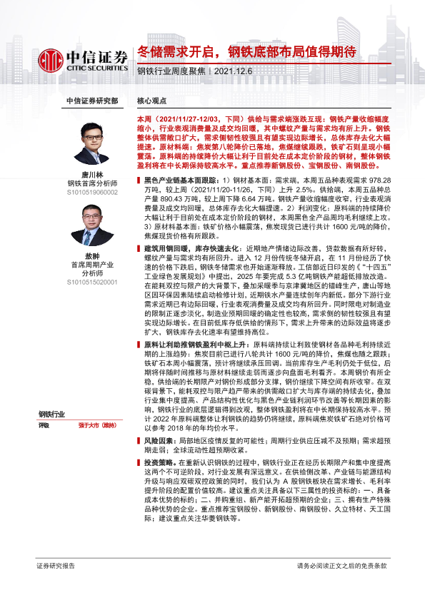 【中信证券】【20211206】20211206-中信证券-钢铁行业周度聚焦:冬储需求开启,钢铁底部布局值得期待-12页
