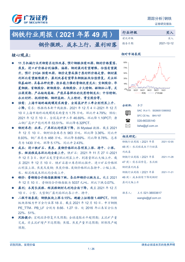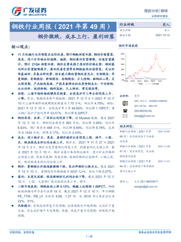 【广发证券】【20211212】钢铁行业周报(2021年第49周):钢价微跌,成本上行,盈利回落-26页