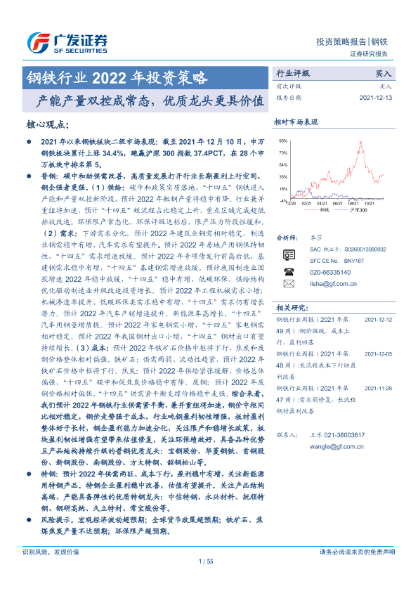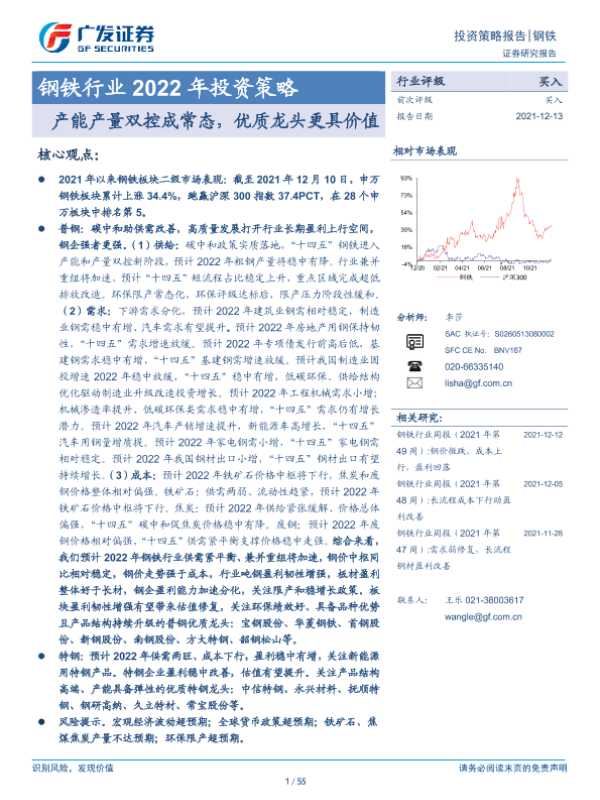 【广发证券】【20211213】钢铁行业2022年投资策略:产能产量双控成常态,优质龙头更具价值-55页