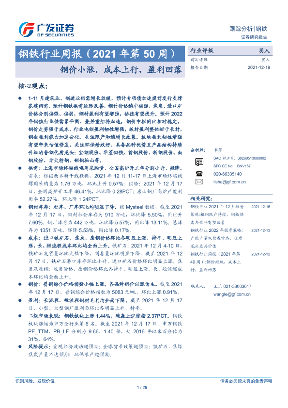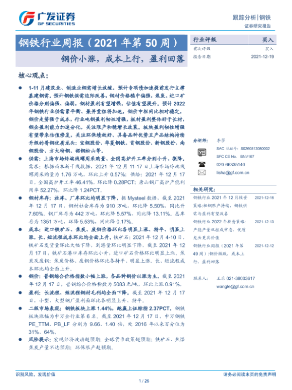 【广发证券】【20211219】钢铁行业周报(2021年第50周):钢价小涨,成本上行,盈利回落-26页
