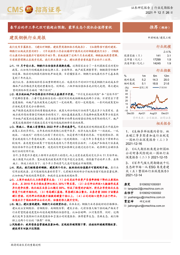 【海通证券】【20211226】建筑钢铁行业周报:春节后的开工季之旺可能超出预期,蒙草生态个股机会值得重视-3页