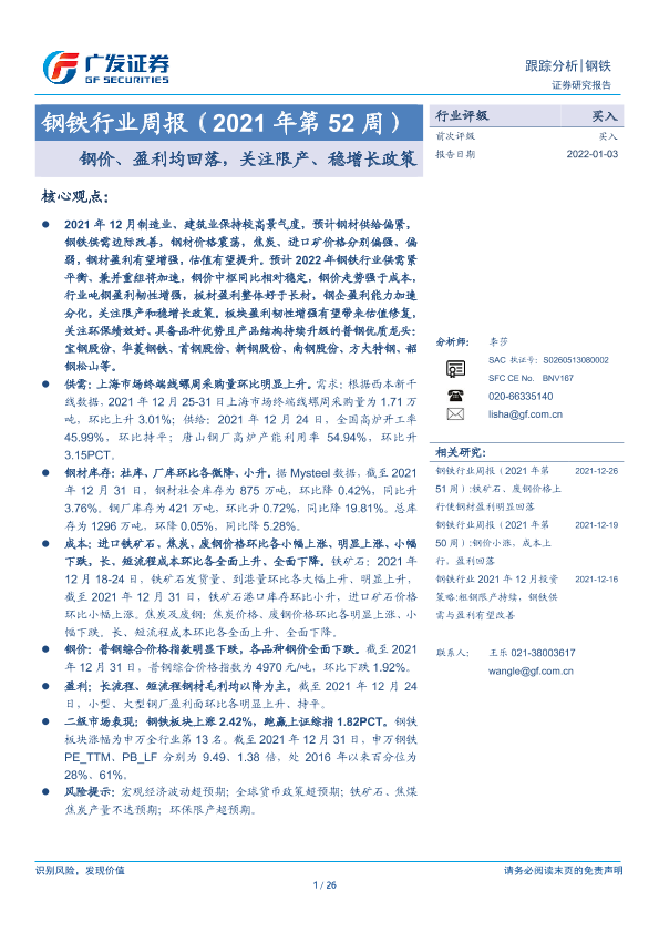 【广发证券】【20220103】20220103-广发证券-钢铁行业周报(2021年第52周):钢价、盈利均回落,关注限产、稳增长政策-26页