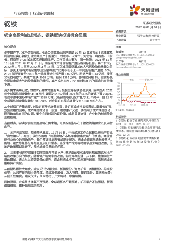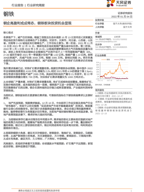 【天风证券】【20220104】20220104-天风证券-钢铁行业研究周报:钢企高盈利或成常态,钢铁板块投资机会显现-13页