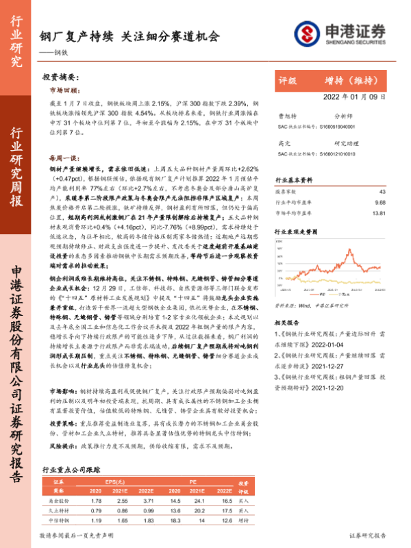 【申港证券】【20220109】钢厂复产持续 关注细分赛道机会——钢铁行业研究周报-6页