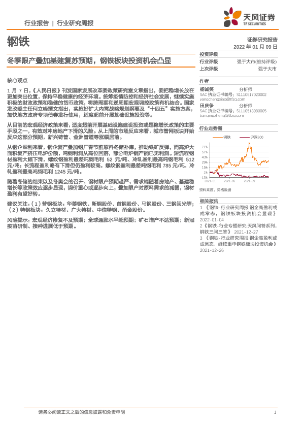 【天风证券】【20220109】20220109-天风证券-钢铁行业研究周报:冬季限产叠加基建复苏预期,钢铁板块投资机会凸显-13页