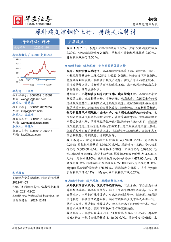 【华安证券】【20220110】20220110-华安证券-钢铁行业周报:原料端支撑钢价上行,持续关注特材-24页