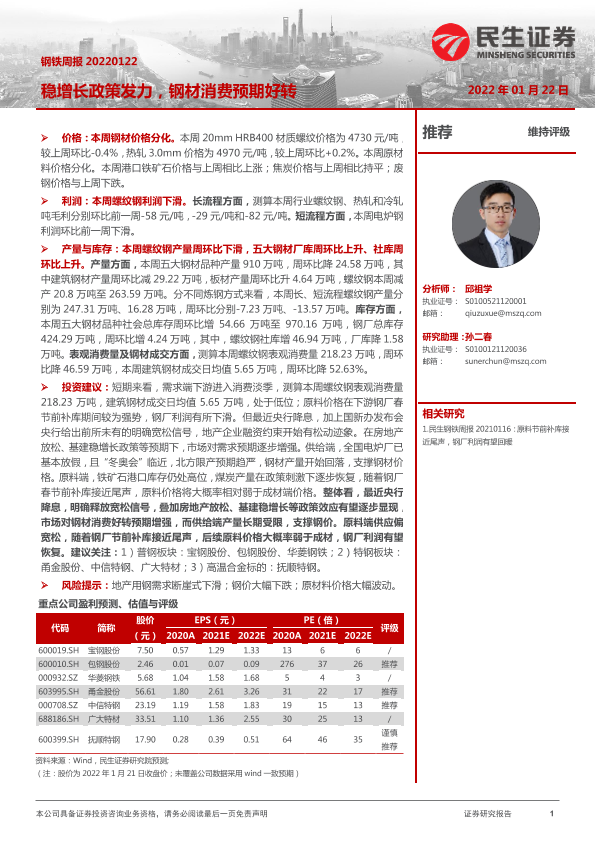 【民生证券】【20220122】20220122-民生证券-钢铁周报:稳增长政策发力,钢材消费预期好转-19页