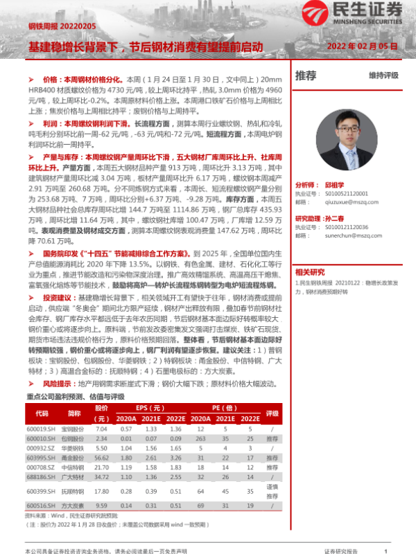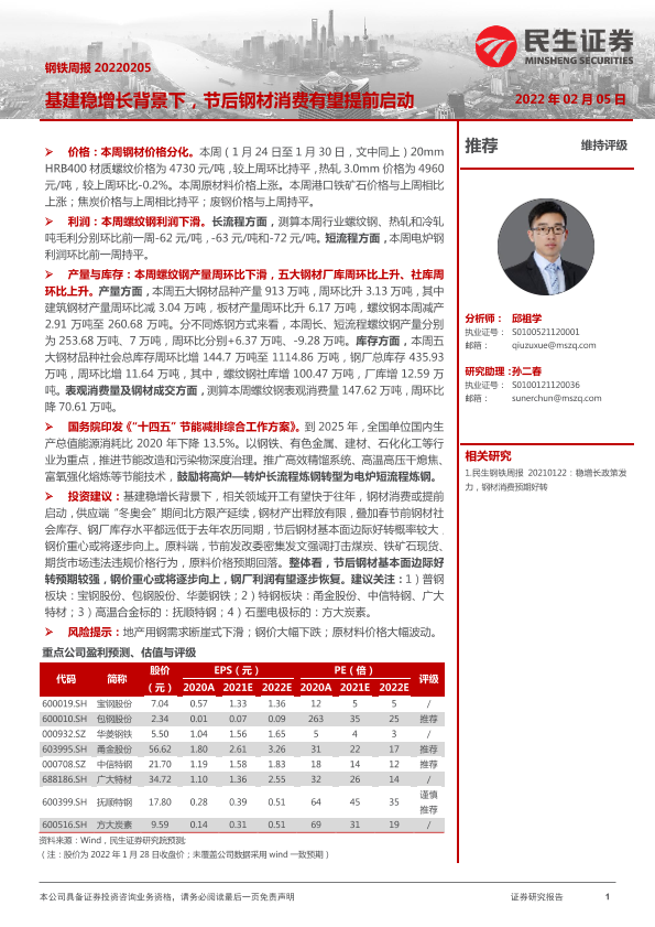 【民生证券】【20220205】20220205-民生证券-钢铁周报:基建稳增长背景下,节后钢材消费有望提前启动-19页