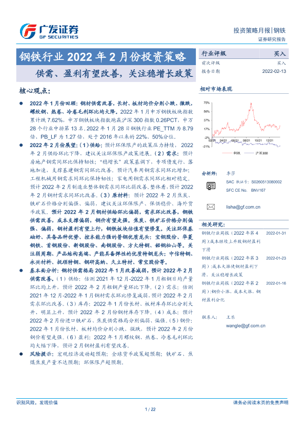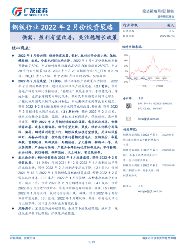 【广发证券】【20220213】钢铁行业2022年2月份投资策略:供需、盈利有望改善,关注稳增长政策-22页