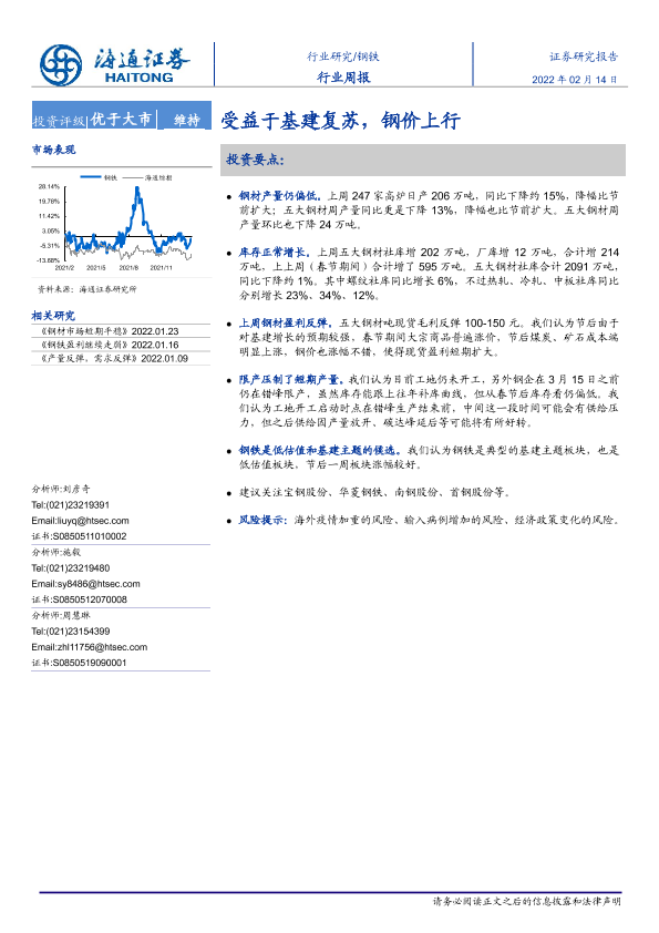 【海通证券】【20220214】20220214-海通证券-钢铁行业周报:受益于基建复苏,钢价上行-13页