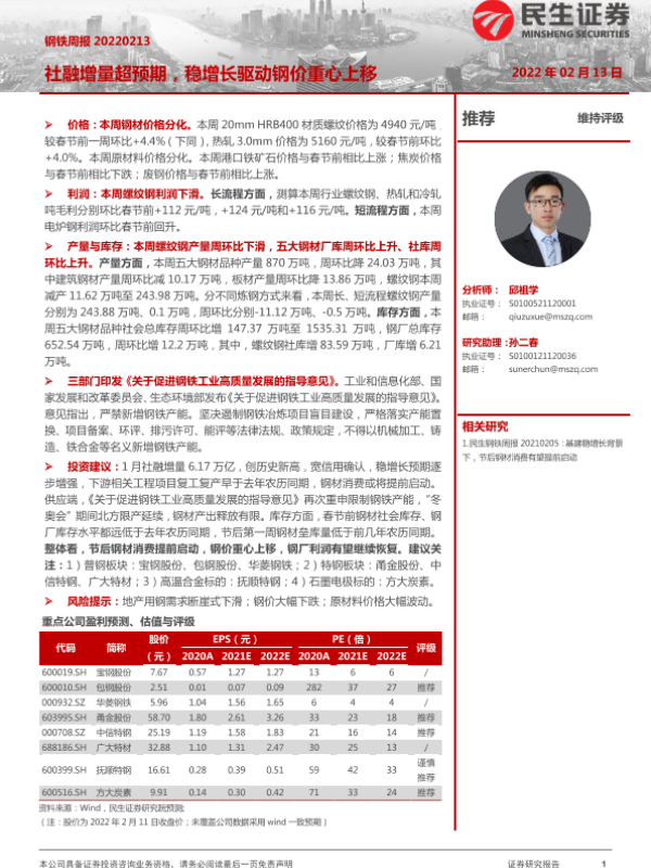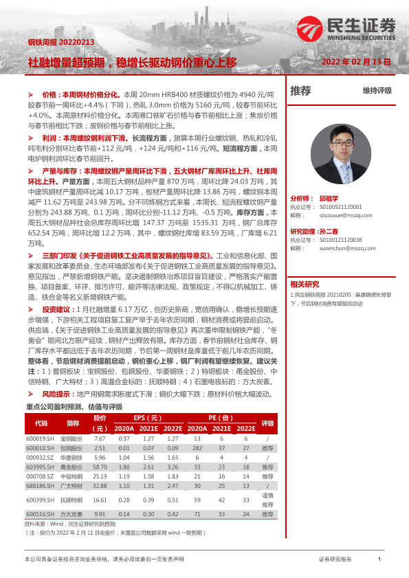【民生证券】【20220213】20220213-民生证券-钢铁周报:社融增量超预期,稳增长驱动钢价重心上移-19页