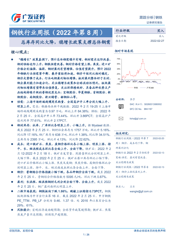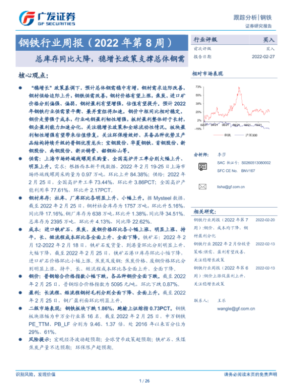 【广发证券】【20220227】钢铁行业周报(2022年第8周):总库存同比大降,稳增长政策支撑总体钢需-26页