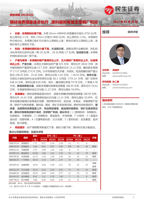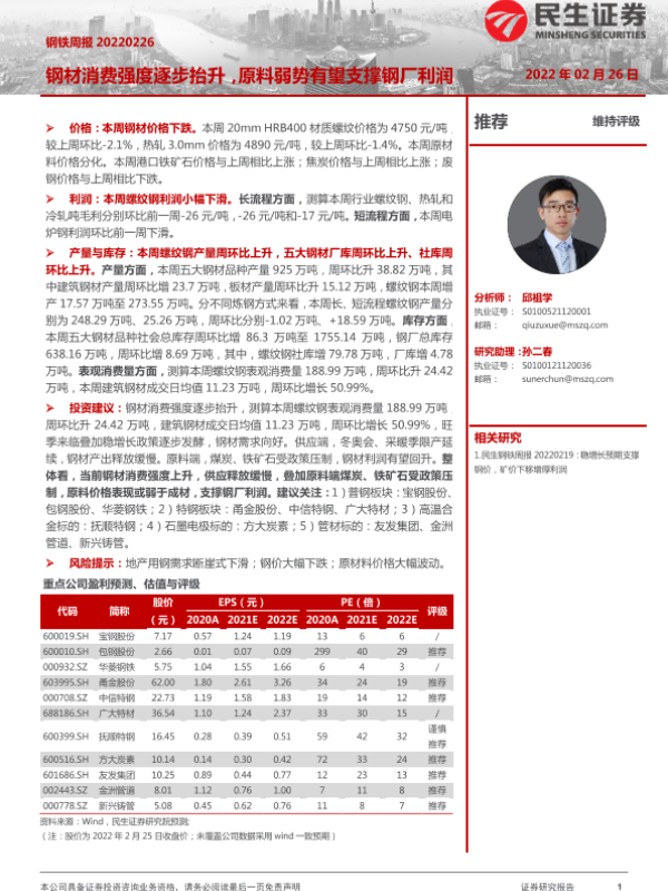 【民生证券】【20220226】20220226-民生证券-钢铁周报:钢材消费强度逐步抬升,原料弱势有望支撑钢厂利润-19页