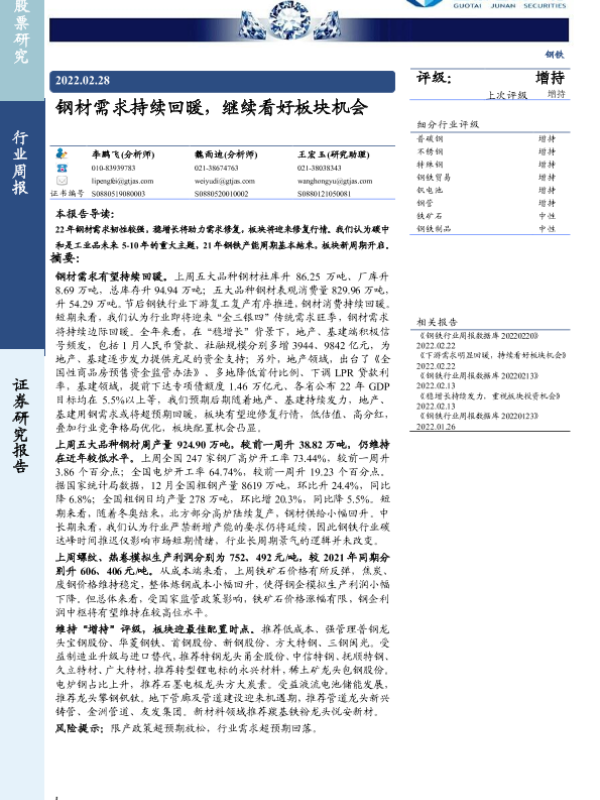 【国泰君安证券】【20220228】20220228-国泰君安-钢铁行业周报:钢材需求持续回暖,继续看好板块机会-21页