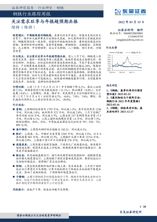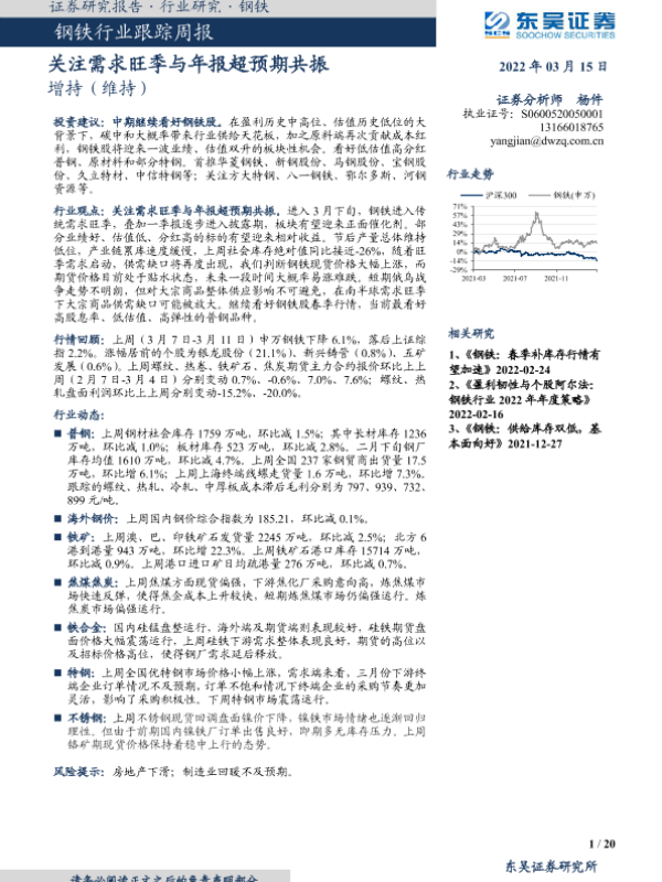 【东吴证券】【20220315】钢铁行业跟踪周报:关注需求旺季与年报超预期共振-20页