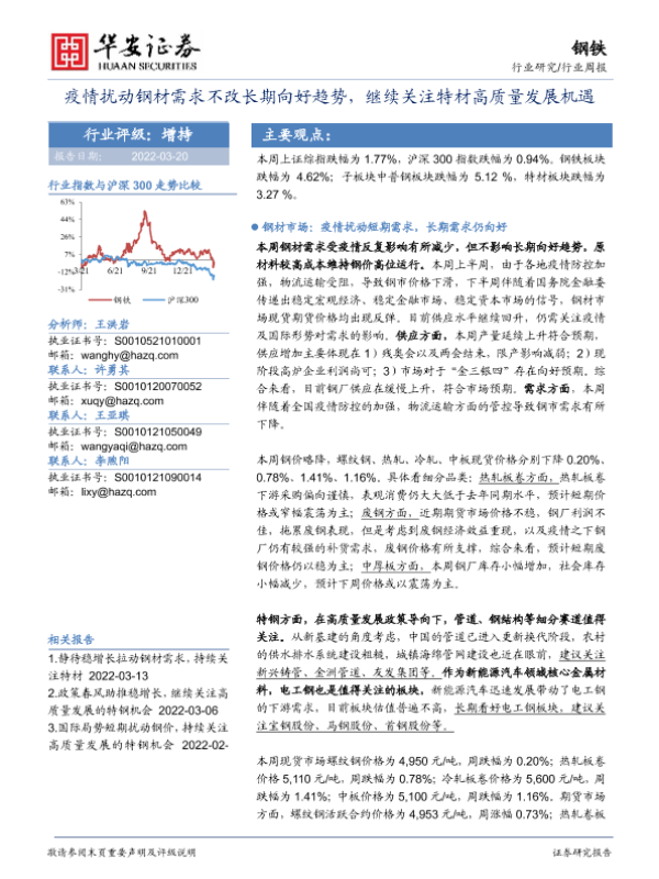 【华安证券】【20220320】20220320-华安证券-钢铁行业周报:疫情扰动钢材需求不改长期向好趋势,继续关注特材高质量发展机遇-24页