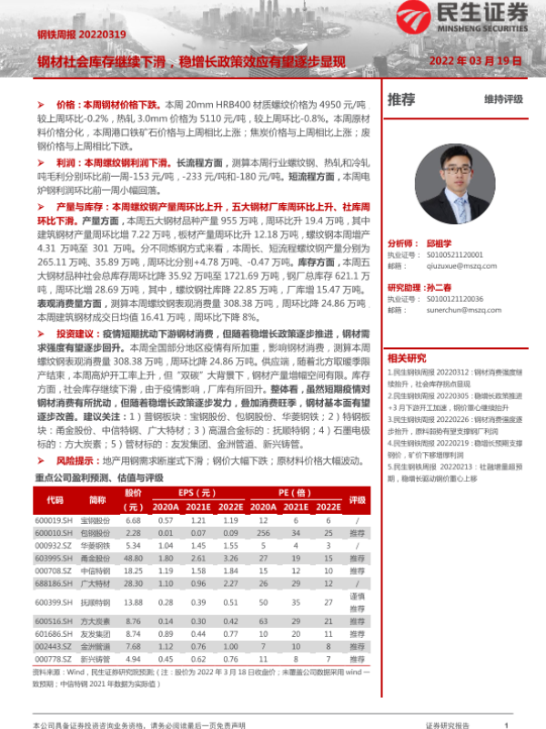 【民生证券】【20220319】20220319-民生证券-钢铁周报:钢材社会库存继续下滑,稳增长政策效应有望逐步显现-19页