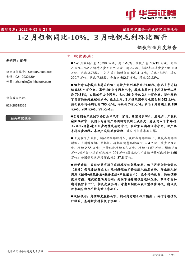 【华宝证券】【202203】20220321-华宝证券-钢铁行业月度报告:1-2月粗钢同比-10%,3月吨钢毛利环比回升-11页