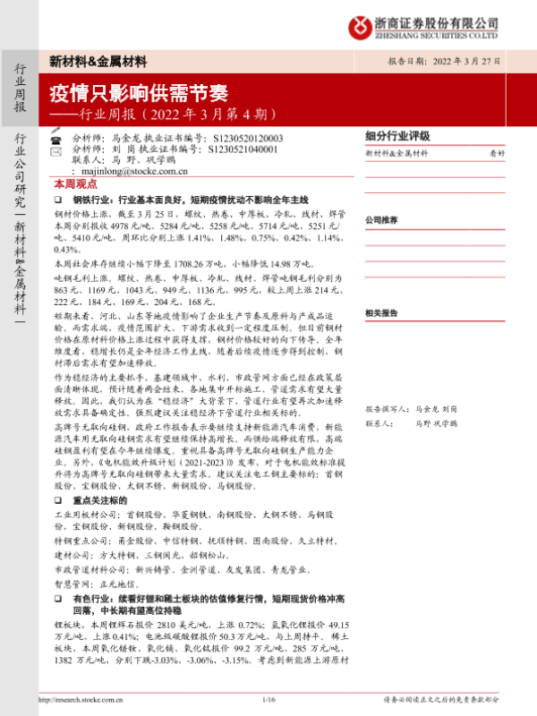 【浙商证券】【20220327】20220327-浙商证券-新材料&金属材料行业周报(2022年3月第4期):疫情只影响供需节奏-16页