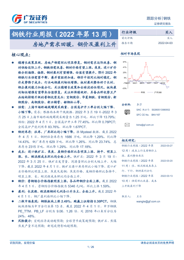 【广发证券】【20220403】20220403-广发证券-钢铁行业周报(2022年第13周):房地产需求回暖,钢价及盈利上升-26页
