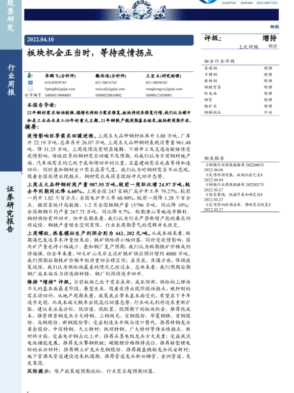 【国泰君安证券】【20220410】20220410-国泰君安-钢铁行业周报:板块机会正当时,等待疫情拐点-25页