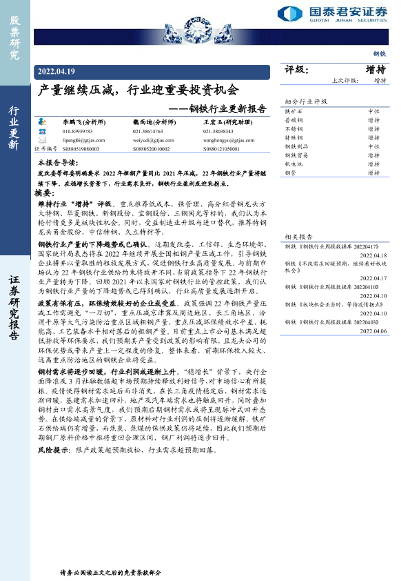 【国泰君安证券】【20220419】产量继续压减,行业迎重要投资机会——钢铁行业更新报告-3页