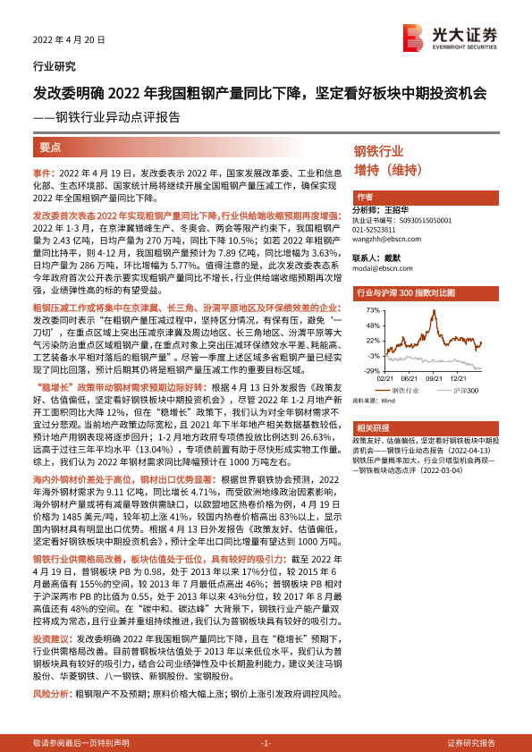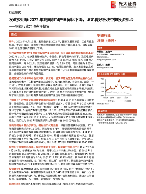 【光大证券】【20220420】20220420-光大证券-钢铁行业异动点评报告:发改委明确2022年我国粗钢产量同比下降,坚定看好板块中期投资机会-3页