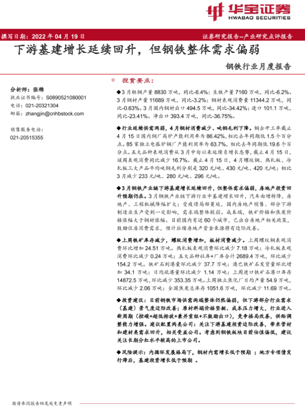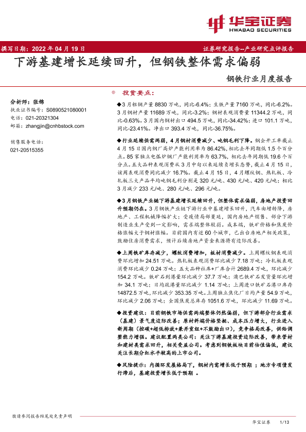 【华宝证券】【20220419】20220419-华宝证券-钢铁行业月度报告:下游基建增长延续回升,但钢铁整体需求偏弱-13页
