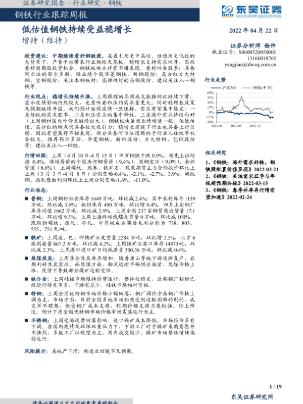 【东吴证券】【20220422】20220422-东吴证券-钢铁行业跟踪周报:低估值钢铁持续受益稳增长-19页