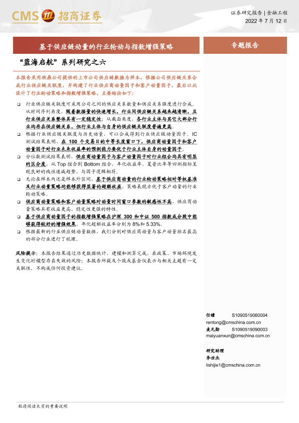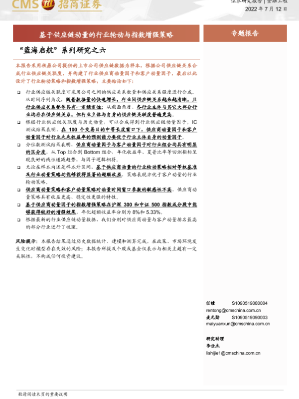 【海通证券】【20220712】“蓝海启航”系列研究之六:基于供应链动量的行业轮动与指数增强策略-21页