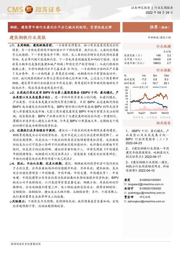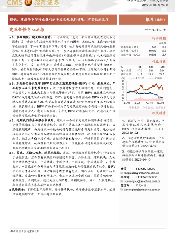 【海通证券】【20220424】建筑钢铁行业周报:钢铁、建筑等中游行业盈利水平应已被压到极限,有望快速反弹-3页
