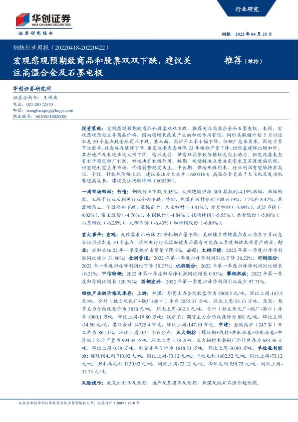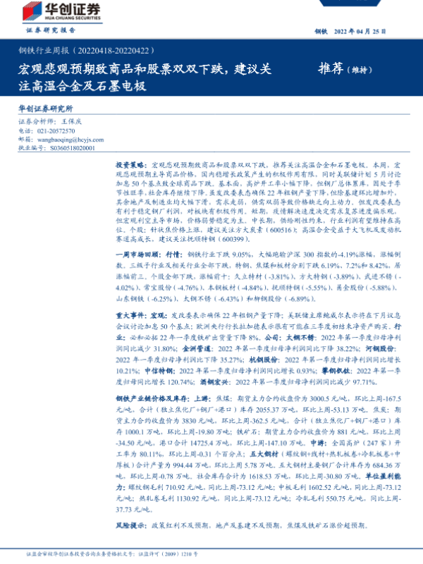 【华创证券】【20220425】20220425-华创证券-钢铁行业周报:宏观悲观预期致商品和股票双双下跌,建议关注高温合金及石墨电极-19页