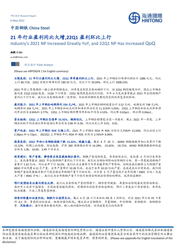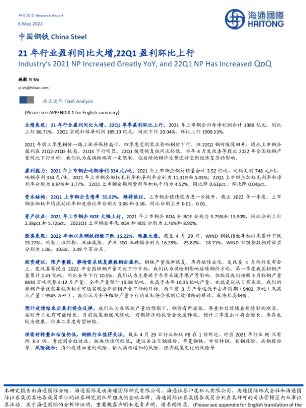 【海通国际】【20220506】21年行业盈利同比大增,22Q1盈利环比上行-19页