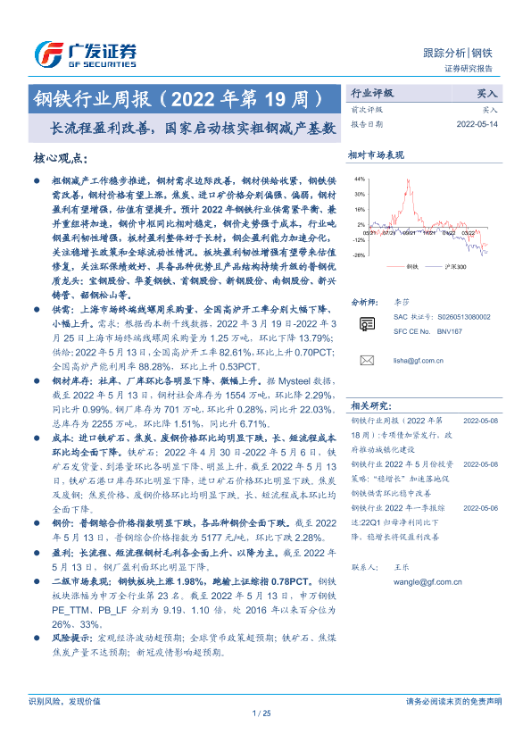 【广发证券】【20220514】2022年第19周钢铁行业周报:长流程盈利改善,国家启动核实粗钢减产基数-25页