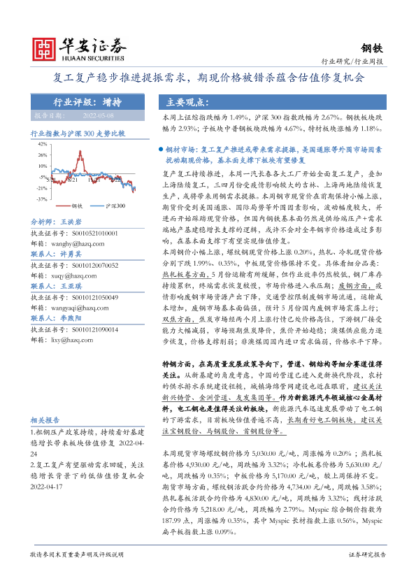 【华安证券】【20220508】20220508-华安证券-钢铁行业周报:复工复产稳步推进提振需求,期现价格被错杀蕴含估值修复机会-23页